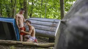 Ethan invites Mickey to continue as he presents himself more fully. Mickey complies, expressing his enthusiasm for the act. This preparation implies that Ethan may soon experience more intense pleasure. Mickey reclines, and Ethan positions himself atop, guiding Mickey inside him. Mickey praises Ethan’s appearance as he moves rhythmically, causing water to ripple. Ethan expresses his pleasure at Mickey’s size as he continues to move.
